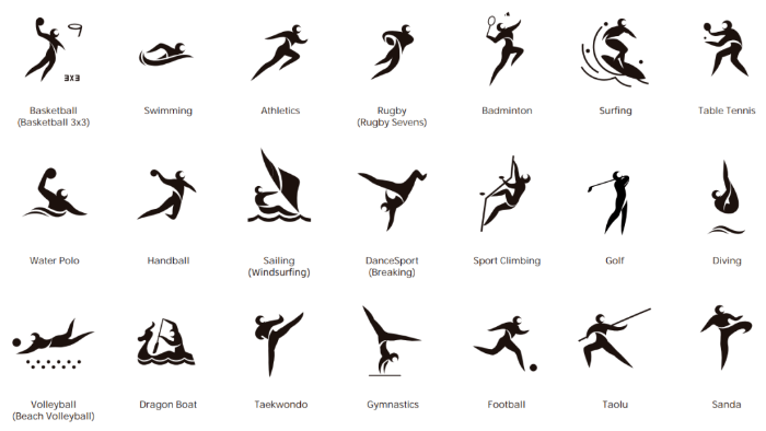 该套体育项目运动图标共包含汕头2021亚青会21项竞赛分项,分别为跳水、游泳、水球、田径、羽毛球、篮球(三人篮球)、体育舞蹈(霹雳舞)、龙舟、足球、高尔夫球、体操、手球、橄榄球(7人制橄榄球)、攀岩、冲浪、乒乓球、跆拳道、帆船(帆板)、排球(沙滩排球)、散打、套路。