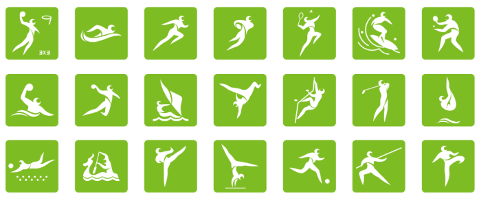 体育项目运动图标在设计上要求对每一个体育单项进行图形化提炼并创作设计。汕头2021亚青会体育项目运动图标围绕“绿叶红花美美与共”的创意理念,结合汕头2021亚青会会徽进行设计,以轻盈矫健的青少年运动员形象展现各体育单项,既符合亚青会参赛运动员青春飞扬的特质,又生动准确地体现了汕头2021亚青会竞赛项目的特点,不仅符合体育图标易识别、易记忆、易使用的简化要求,更通过其特有的形态,将体育图标运用特征和丰厚的文化内涵、理念达到形与意的和谐统一。色彩运用单色与双色两种形式,确保视觉形象整体风格的统一性和延续性。