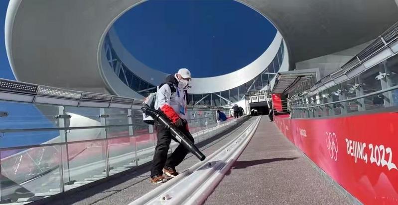国家跳伞跳台滑雪队教练翟晓猛,冬奥会期间几乎每一天都会在陡峭度接近40度的助滑道上,拿着吹雪机清洁助滑道。