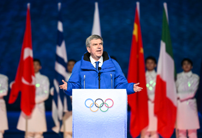 2月20日晚,北京第二十四届冬季奥林匹克运动会闭幕式在国家体育场举行。这是国际奥委会主席巴赫致辞。新华社记者李尕摄