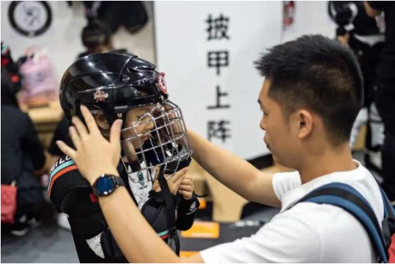 在深圳昆仑鸿星冰球气膜馆,很多孩子走上冰场,开启了人生第一堂冰球课。(受访单位供图)