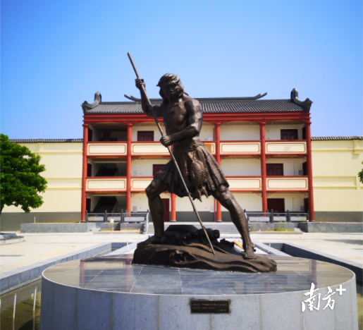 在沙坑文化博物馆门口陈列的大型雕塑《原始猎人》