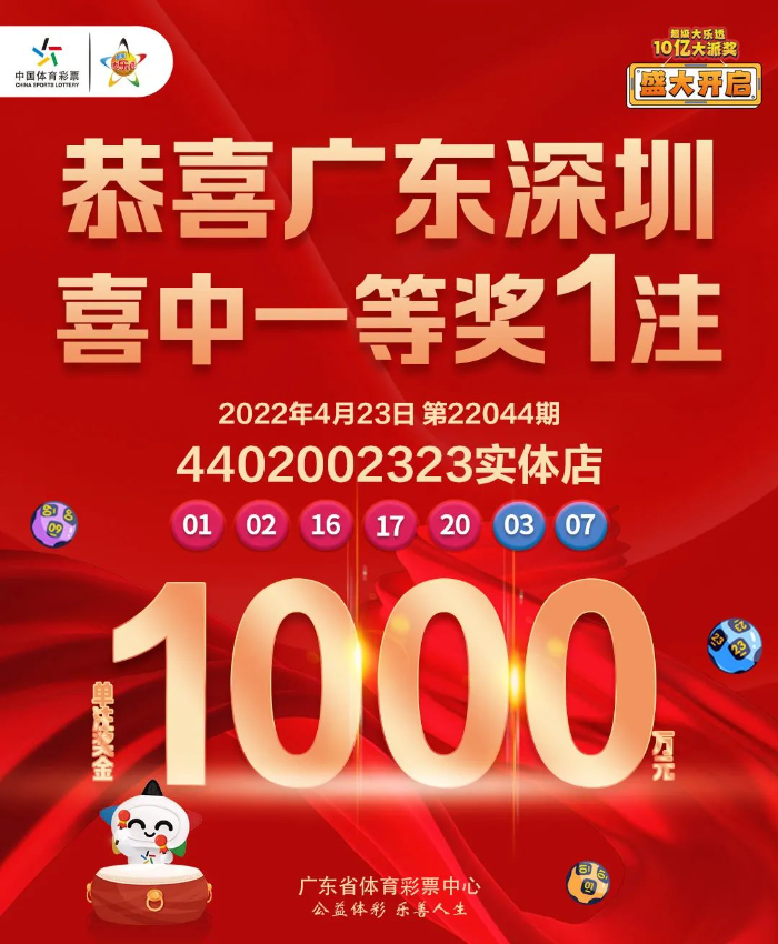 超级大乐透第22044期,1注1000万元基本投注一等奖花落深圳。中奖彩票是一张7+3复式票,单票揽获奖金1038万余元。遗憾的是,深圳购彩者未采用大乐透追加投注功能,错失了827万追加奖金和1522万派奖奖金。