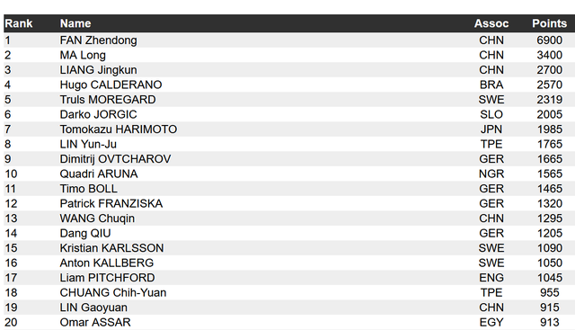 国际乒联公布最新世界排名,樊振东继续领跑男单榜单