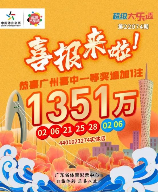 体彩超级大乐透第22074期,全国共开出5注一等奖。其中一注1351万元(含600万元追加奖金)追加投注一等奖花落广州。中奖彩票是一张投注额为15元的5注追加单式票,第1注号码揽获大奖。