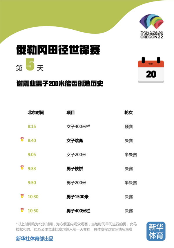 2022俄勒冈田径世锦赛将于当地时间7月15日至24日在美国俄勒冈州尤金市举行。由于比赛地与北京有15个小时的时差,为方便国内观众观赛,我们特意按照北京时间整理了一份世锦赛每日观赛时间表。日期、比赛时间统统都是北京时间!不用再去掰着手指头算时差,苏炳添、巩立姣等中国队名将每一轮比赛全部一目了然,快快收藏吧!