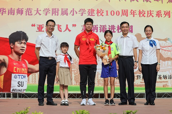 26日,苏炳添参加了学校的升旗仪式,并与师生们合影留念,学生代表为他戴红领巾、送上鲜花,他在致辞中首先向华师附小百年华诞致以热烈的祝贺,称这里不仅是教育久负盛名,他还知道华师附小田径队有着优良的传统,是广州市中小学田径项目的冠军。