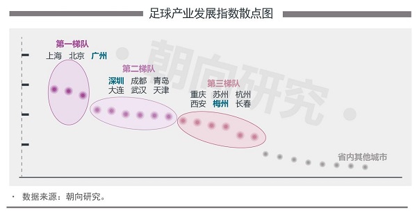 基于相关统计数据的可得性、城市的社会经济地位和地域代表性以及城市的足球产业发展基础及特色,《报告》选取了15个城市作为本次指数研究的样本,省内城市代表为广州、深圳和梅州。省外城市分别为北京、上海、天津、重庆、成都、苏州、杭州、武汉、青岛、大连、西安、长春。通过横向比较15个城市之间足球产业发展水平的差异,探求其发展水平差异背后的深层次原因,在此基础上科学、公正、有效地对广东省足球产业的发展水平进行评价。依照指数总体情况,《报告》将15城市划分为三大梯队。广州与北京、上海3城市在全国领先优势明显,各方面表现均衡,稳居第一梯队;深圳与成都、青岛、大连、武汉和天津等城市位居第二梯队;梅州与重庆、苏州、杭州、西安、长春等城市暂列第三梯队。广东省三个城市代表分列三个梯队,显示出不同的发展特点。省内其他城市的足球产业整体发展水平与广州、深圳和梅州3城市差距较大,产业发展的诸多基础数据缺乏,因而难以纳入指数指标体系进行量化研究。但从指标体系出发,仍可挖掘出各城市以及广东省整体在足球产业发展方面的诸多亮点与创新点。