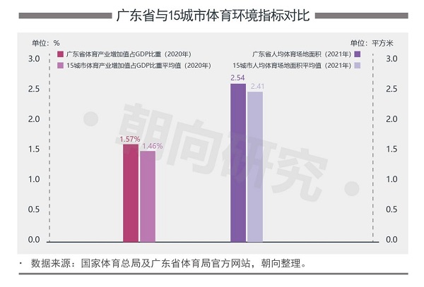 体育环境指标方面,广东省2020年体育产业增加值占GDP比重达1.57%,高于15城市平均值(1.46%)。截至2021年底,广东省人均体育场地面积2.54平方米,同样高于15城市平均水平(2.41平方米)。