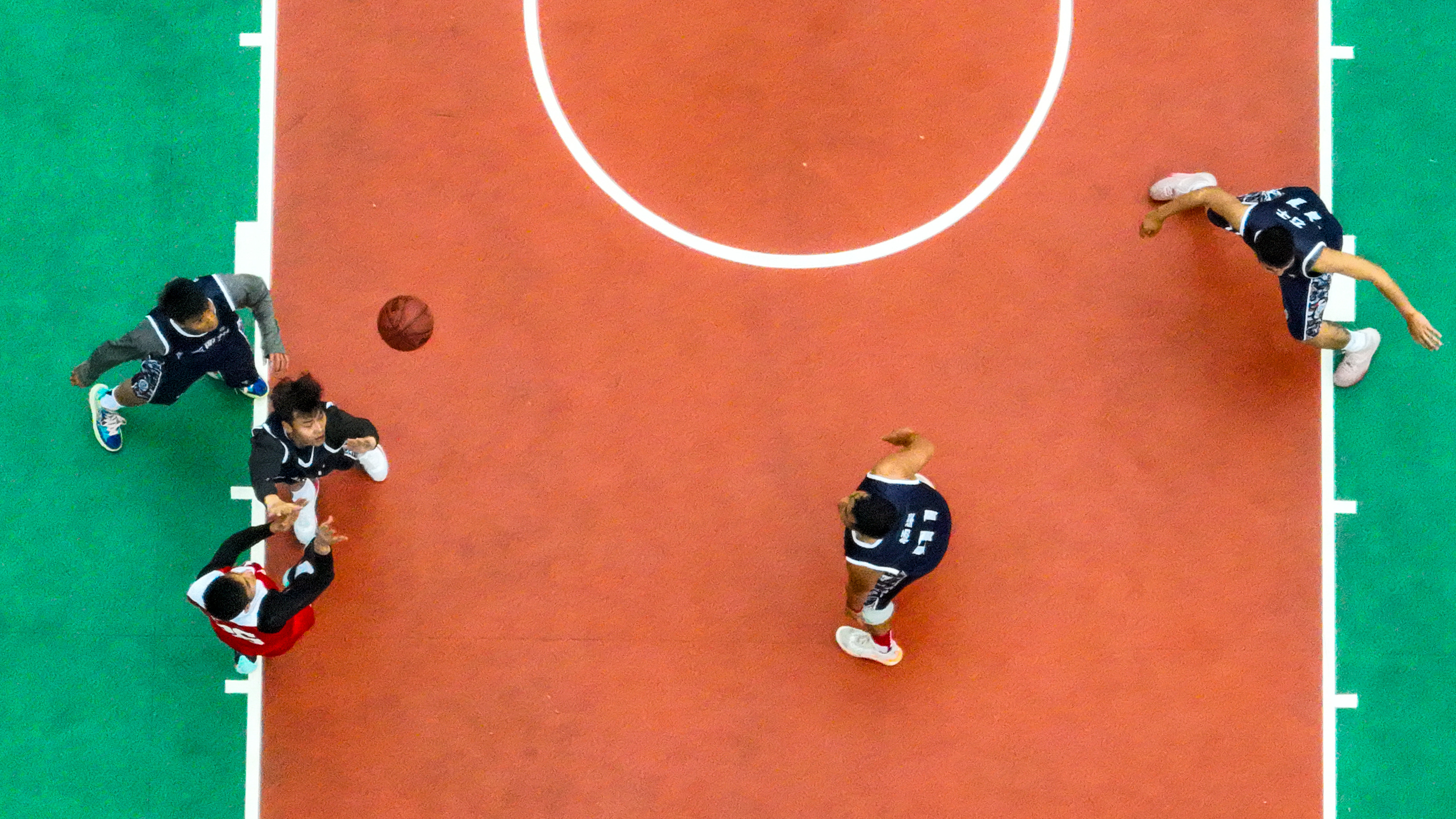 3月27日,贵州省首届“美丽乡村”篮球联赛总决赛在黔东南州台江县台盘村举行,黔东南州代表队以68比65的比分战胜遵义市代表队,获得冠军。双方球员在比赛中拼抢(无人机照片)。新华社记者欧东衢摄