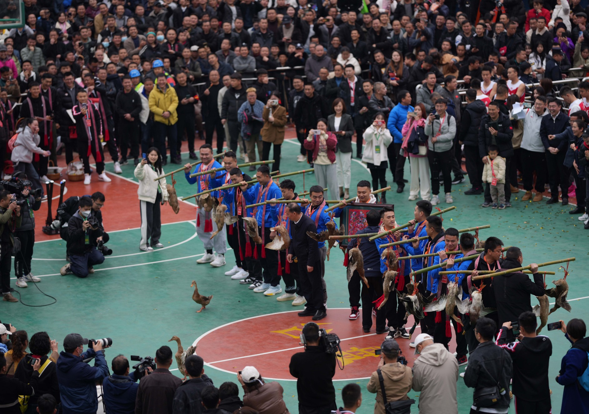 3月27日,贵州省首届“美丽乡村”篮球联赛总决赛,季军铜仁市代表队在颁奖仪式上领取奖品“三穗麻鸭”。新华社记者李尕摄