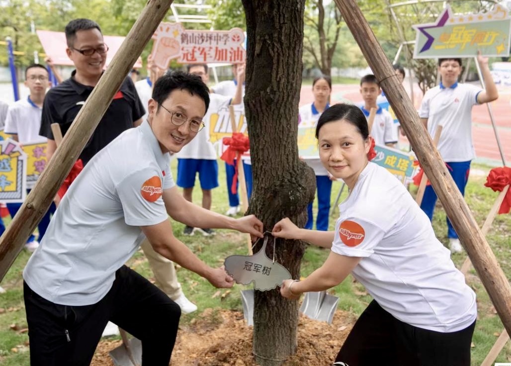 最后,一众来宾来到户外共同为纪念意义非凡的“冠军树”培土。此外,主办方携手爱心企业,向学校捐赠了校体通学生体质健康管理平台使用权、智慧体育课堂体验课、智慧体育课堂心率监测设备一套,以履行公益使命,推动青少年体能体质与智慧体育管理发展。2023年6月,传统民俗和体育活动“三夹腾龙 ”(鹤山)被列入广东非遗,沙坪中学向冠军和嘉宾们赠送了该校参与鹤山市文旅产品创作单位设计的纪念品。接下来,“与冠军同行”系列活动将按照与乡村振兴战略和体教融合相结合的新思路,进一步提升“与冠军同行”的公益性,以体育促“百千万工程”实施发展。