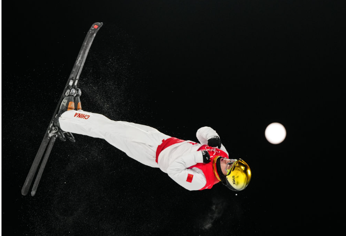 2月16日,中国队选手齐广璞在自由式滑雪男子空中技巧决赛中。新华社记者朱峥摄