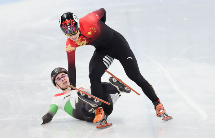 2月7日,中国队选手任子威(上)与匈牙利队选手刘少林在短道速滑男子1000米决赛中冲线后。新华社记者兰红光摄
