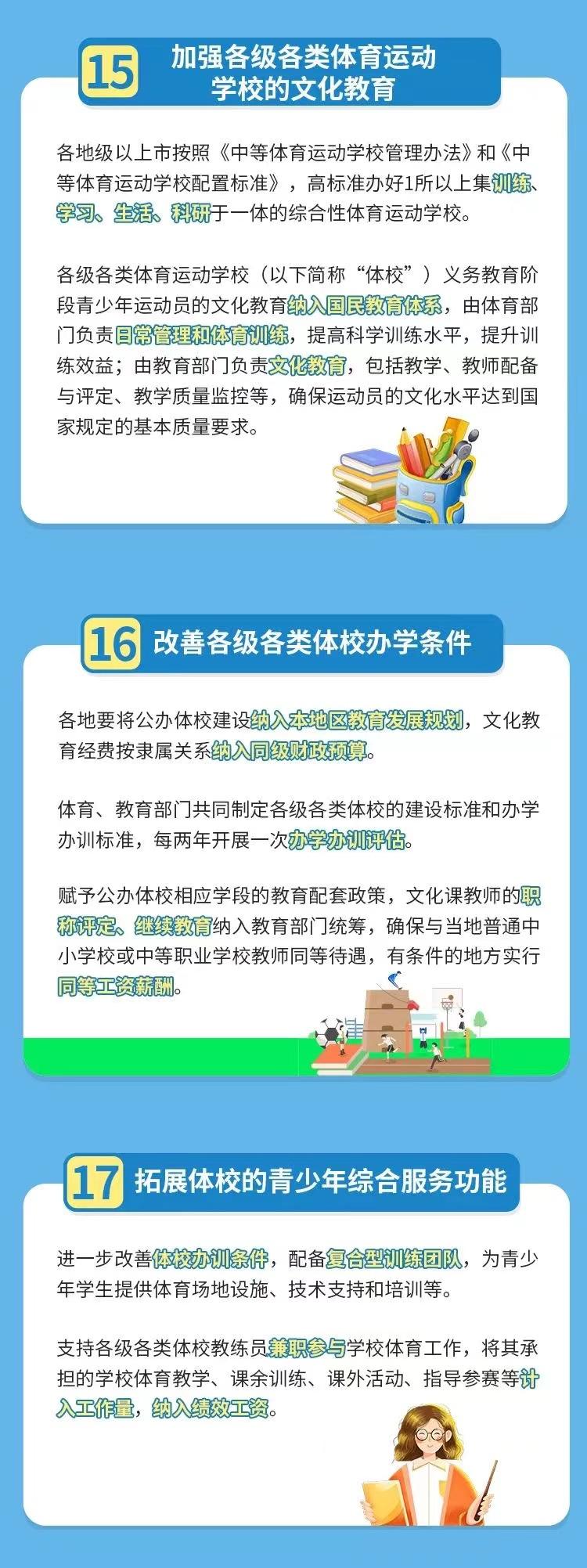 而体校也是《实施意见》重点关注的,作为竞技体育后备人才阵地,必须强化各级体育部门的相关职能,同时强调“共同建设”,县区采用体校建在普通学校的模式,而各地级以上市按相关文件要求,高标准办好一所以上集训练、学习、生活、科研于一体的综合性体育运动学校,各地要将公办体校建设纳入本地区教育发展规划,文化教育经费按隶属关系纳入同级财政预算,由教育部门负责文化教育,包括教学、教师配备与评定、教学质量监控等,确保运动员的文化水平达到国家规定的基本素质要求,文化课教师的职称评定、继续教育纳入教育部门统筹,与普通学校老师同等待遇。
