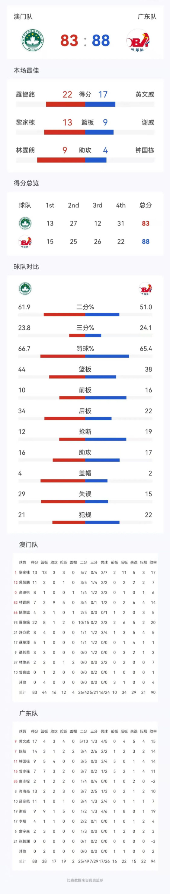 比赛最终定格83:88,澳门败惜,广东队险胜5分,先拔头筹客场取胜。