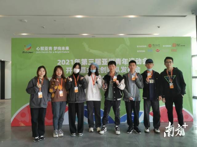 在汕头亚青会开闭幕主创团队发布会上,汕头大学志愿者协助进行交通指引、防疫检查、提供问询服务。