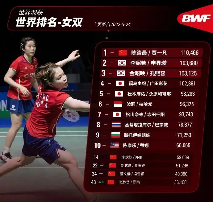 世界羽联公布最新一期世界排名,陈清晨与搭档位列女双榜首