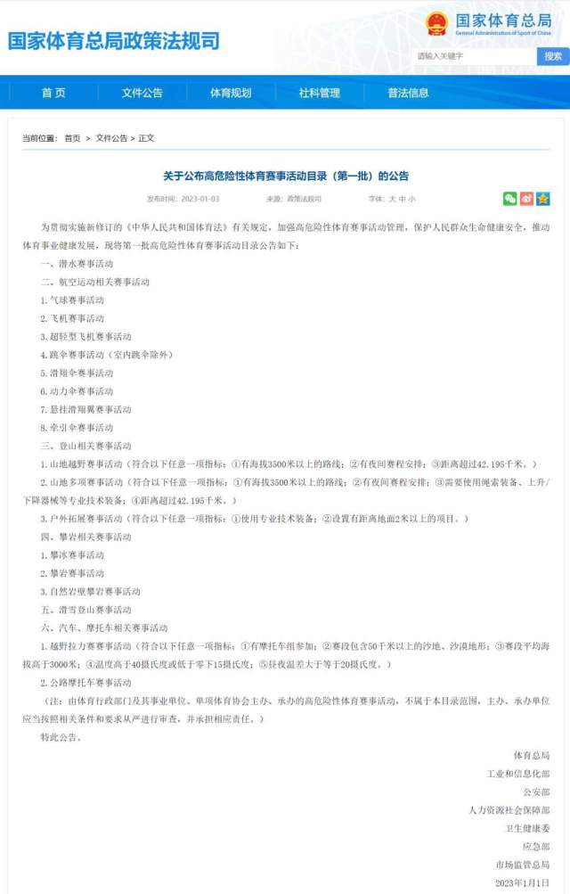 《目录》明确了列入第一批高危险性体育赛事活动的类型和标准,由体育总局联合工业和信息化部、公安部、人力资源社会保障部、卫生健康委、应急部、市场监管总局公开发布。
