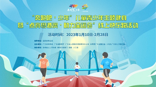 1月10日,“奔跑吧·少年”儿童青少年主题健身暨“点亮粤港澳·助力全运会”线上快乐跑活动开启,活动将持续至2月28日,以线下快乐奔跑、线上虚拟打卡为主要形式,设置21个地级以上市及香港、澳门特别行政区作为线上虚拟打卡点。
