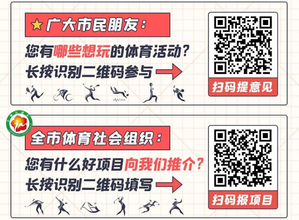 新的一年,广州市体育局、广州市体育总会坚持“人民体育人民办、人民体育为人民”原则,邀请广大市民及体育社会组织为2023年“羊城运动汇”赛事活动“玩什么、怎么玩”建言献策。在2023年2月10日前参加“我想玩的体育活动”“我有好项目推荐”两项征集活动,来提出您的宝贵意见吧!