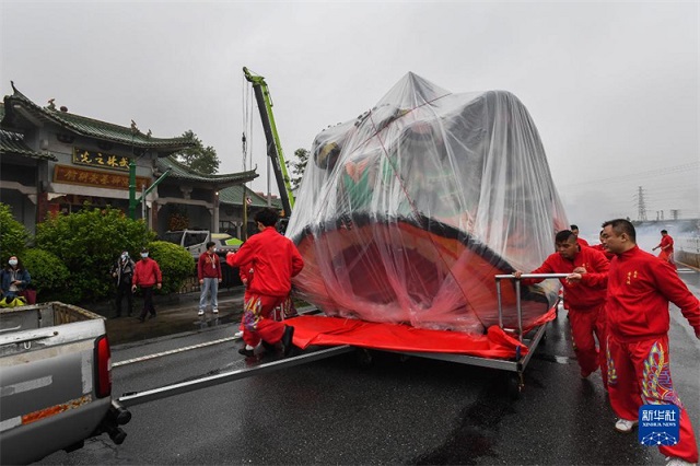 1月12日,高4.68米、宽4.5米的“狮王”狮头被请出佛山市南海区西樵山黄飞鸿狮艺武术馆(无人机照片)。