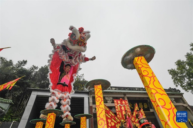 1月13日,在佛山市南海区黄飞鸿中联龙狮训练基地,选手在训练高桩醒狮。