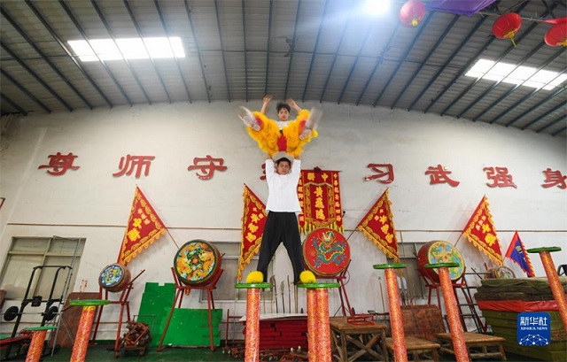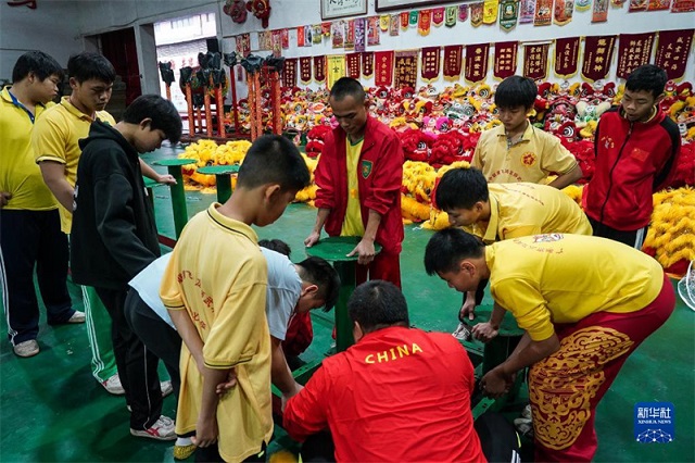 1月13日,在佛山市南海区黄飞鸿中联龙狮训练基地,来自广州市从化区练习醒狮的青少年跟随教练搭建高桩。