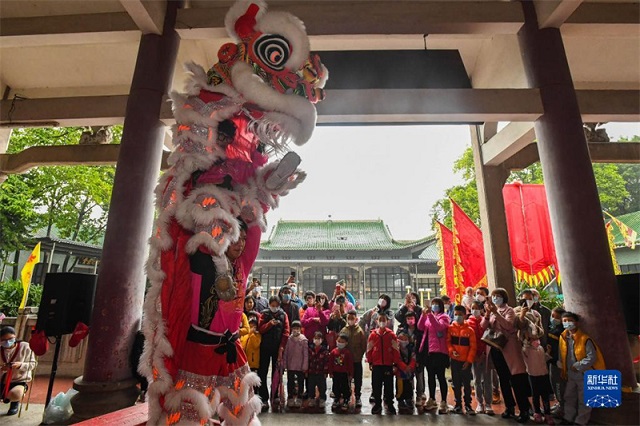 1月12日,在佛山市南海区西樵黄氏宗祠,这里现在也是黄飞鸿狮艺武术馆,狮团为游客表演醒狮。