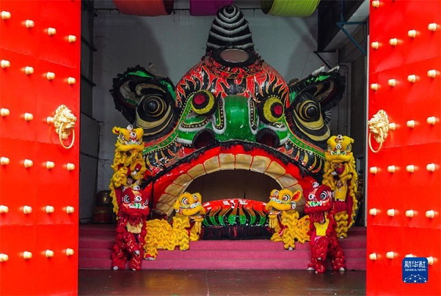 1月12日,高4.68米、宽4.5米的“狮王”狮头被请出佛山市南海区西樵山黄飞鸿狮艺武术馆。