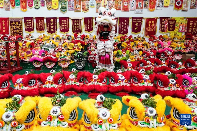 1月13日,在佛山市南海区黄飞鸿中联龙狮训练基地,一头醒狮“淹没”在身边的“狮海”里。