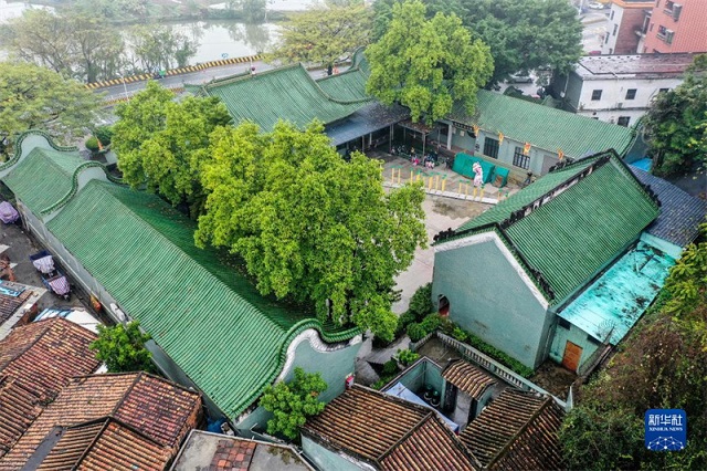 1月12日,在佛山市南海区西樵黄氏宗祠,这里现在也是黄飞鸿狮艺武术馆,狮团为游客表演醒狮(无人机照片)。