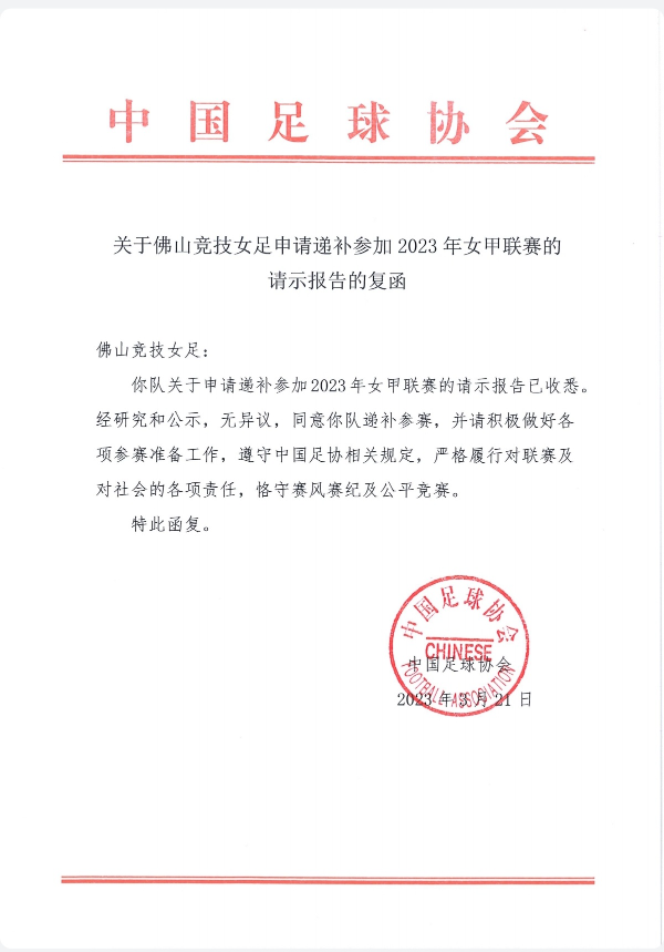 中国足球协会《关于佛山竞技女足申请递补参加2023年女甲联赛的请示报告的复函》