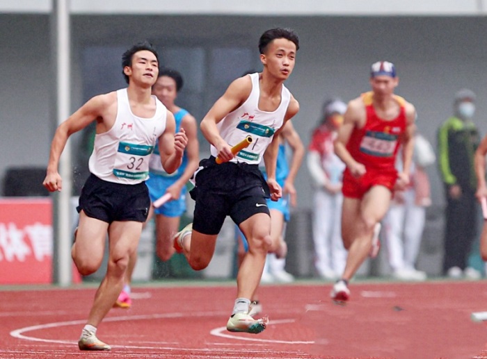 萧梓铠(左)、吴昊霖(中)在男子乙组4×100米接力比赛中