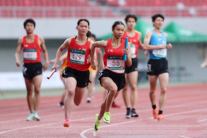 黎倩彤(55号)在女子丙组4×100米接力比赛中