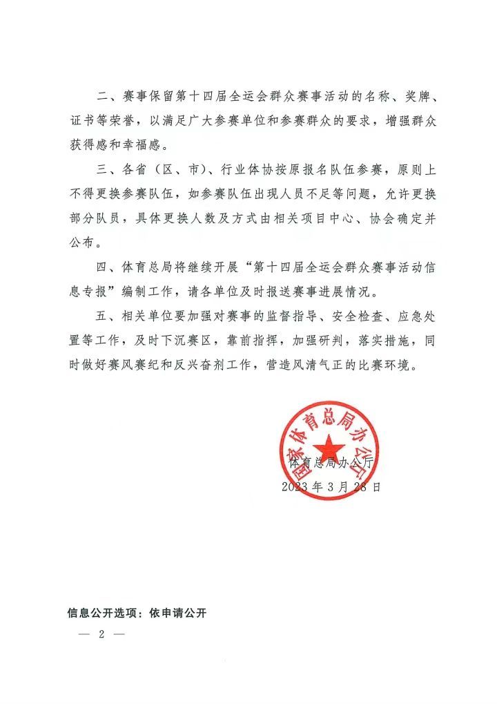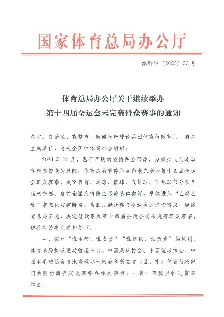 国家体育总局办公厅日前印发通知,明确继续举办第十四届全运会未完赛的群众赛事。十四运会群众赛事活动项目分为比赛类和展演类,大部分已完成。2021年10月,鉴于疫情防控形势严峻,为减少人员流动和聚集带来的风险,体育总局暂停举办尚未完赛的群众赛事。截至目前,足球、篮球、气排球、羽毛球部分项目尚未完赛。随着全国疫情防控形势总体向好,为满足群众参赛需求,经向相关单位征求意见并会同各方进行研判,体育总局决定继续举办十四运会尚未完赛的群众赛事。