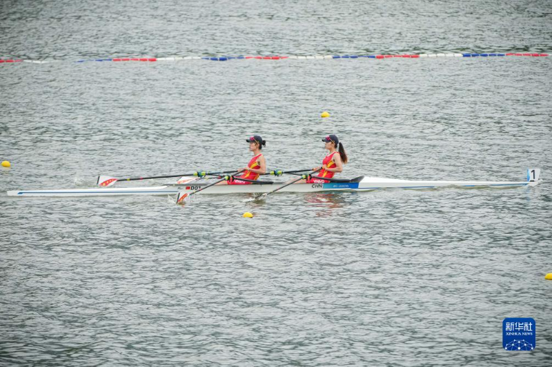 9月20日,中国组合鲁诗雨、沈双美(左)在女子双人双桨预赛中。她们以6分51秒31的成绩晋级决赛(图/新华社)