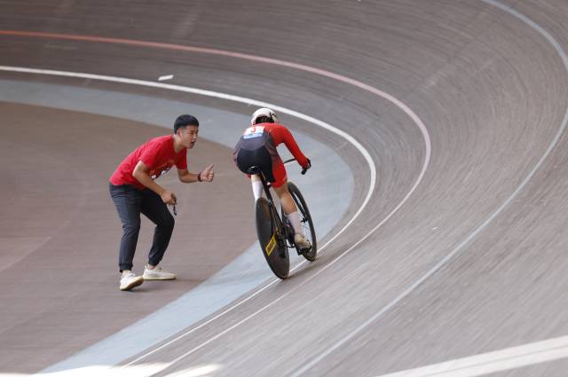 参赛选手在赛场上角逐骑行,教练正在打气助威