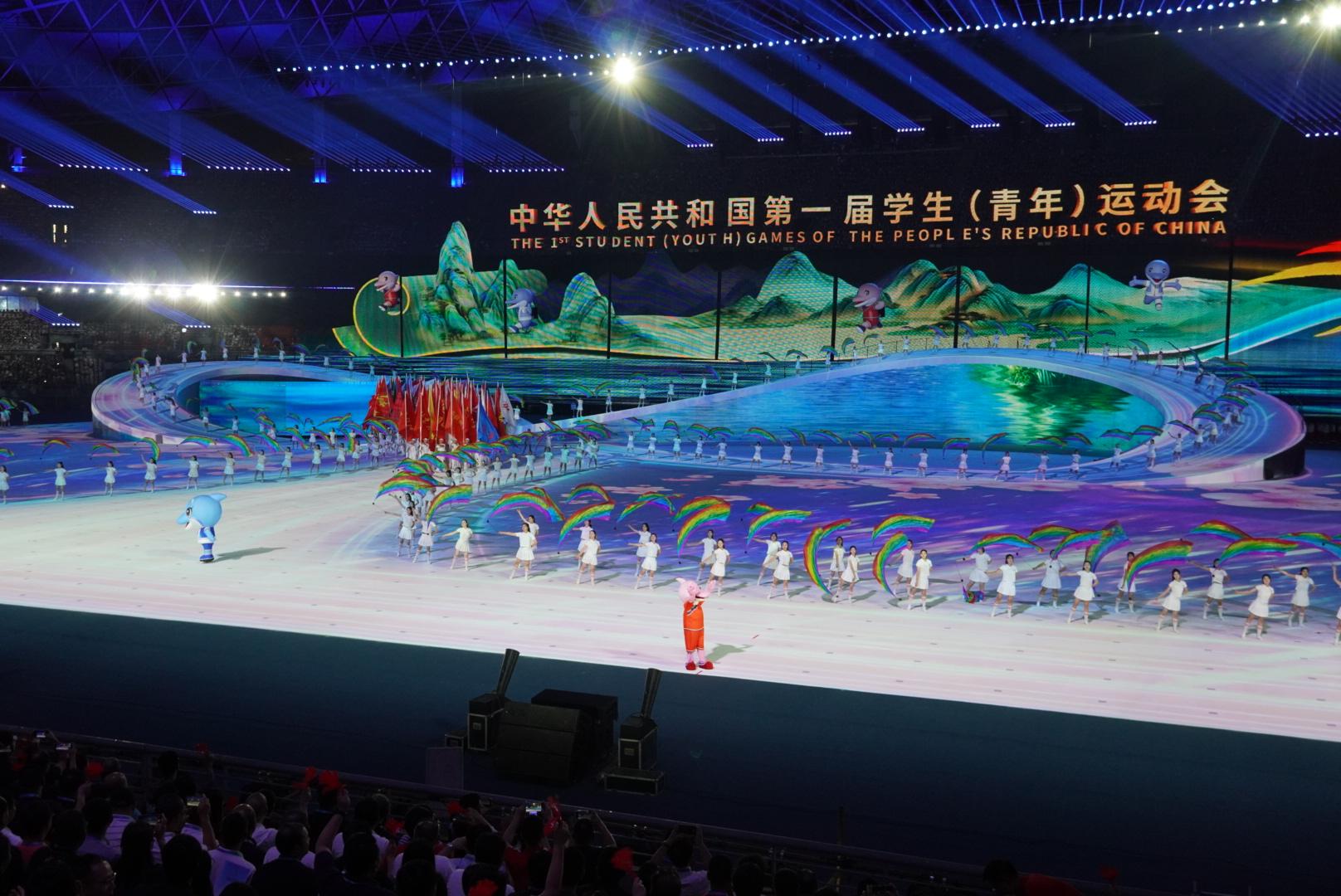 开幕式舞美以赛道的延伸、拓展和螺旋上升为形态,构筑充满想象的青春空间,寓意学生青年一代在赛道上奋勇前行、奔赴未来。