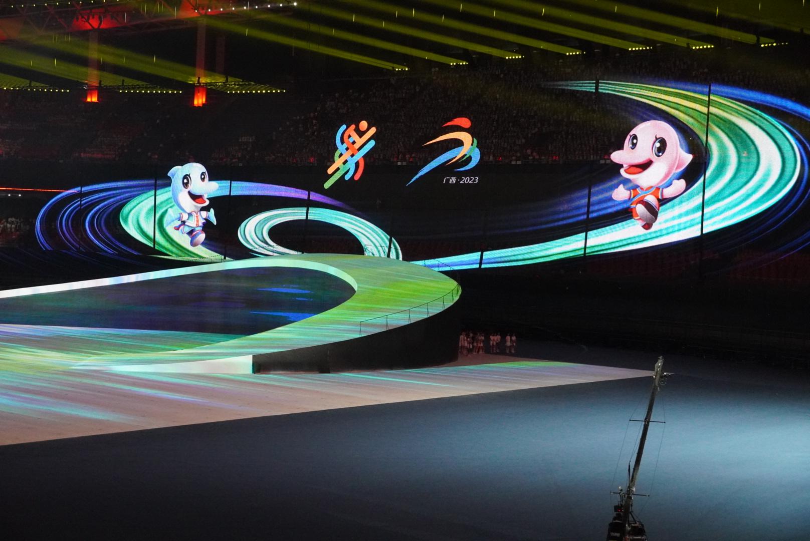 首届学青会开幕式以“绿”为第一抹主题色,以“山水间”作为开幕式的一大创新亮点,通过艺术重构山水的方式,带领观众进入壮美广西、大美中国的诗意画卷。