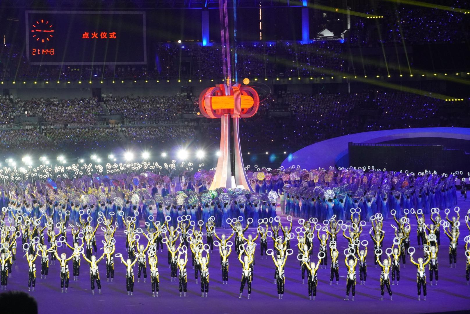 在开幕式最重要的点火环节,导演组的设计别出心裁:本届学青会火炬塔和点火仪式以“青春聚能”为创意核心,仪式及演出中见不到主火炬塔“聚能环”,现场青年演员们依托自己的力量,以“搭积木”方式共同完成火炬塔的构建。随着“聚能环”由优秀学生代表和杰出青年运动员共同点燃,开幕式气氛达到最高潮,这场“青春、友谊、团结”的盛会正式开幕。