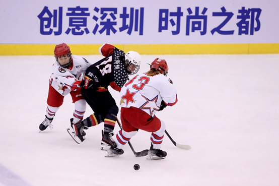 深圳昆仑鸿星女子冰球队与齐齐哈尔市兰迪女子冰球队展开较量。俱乐部供图