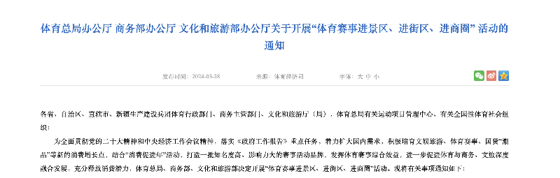 据国家体育总局网站消息,3月28日,国家体育总局办公厅、商务部办公厅、文化和旅游部办公厅发布《关于开展“体育赛事进景区、进街区、进商圈” 活动的通知》,进一步促进体育与商务、文旅深度融合发展,充分释放消费潜力。