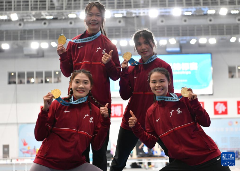 冠军广东队梁诺(左上)、孔莹蓥(左下)、严海玲(右上)、莫家蝶在2024年全国室内田径锦标赛女子4X400米颁奖仪式上(图/新华社)