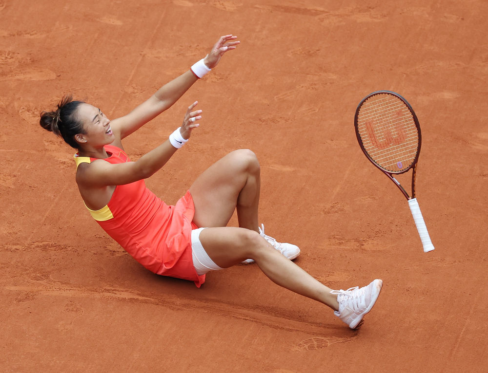 中国选手郑钦文在巴黎奥运会网球女子单打金牌赛后庆祝夺冠