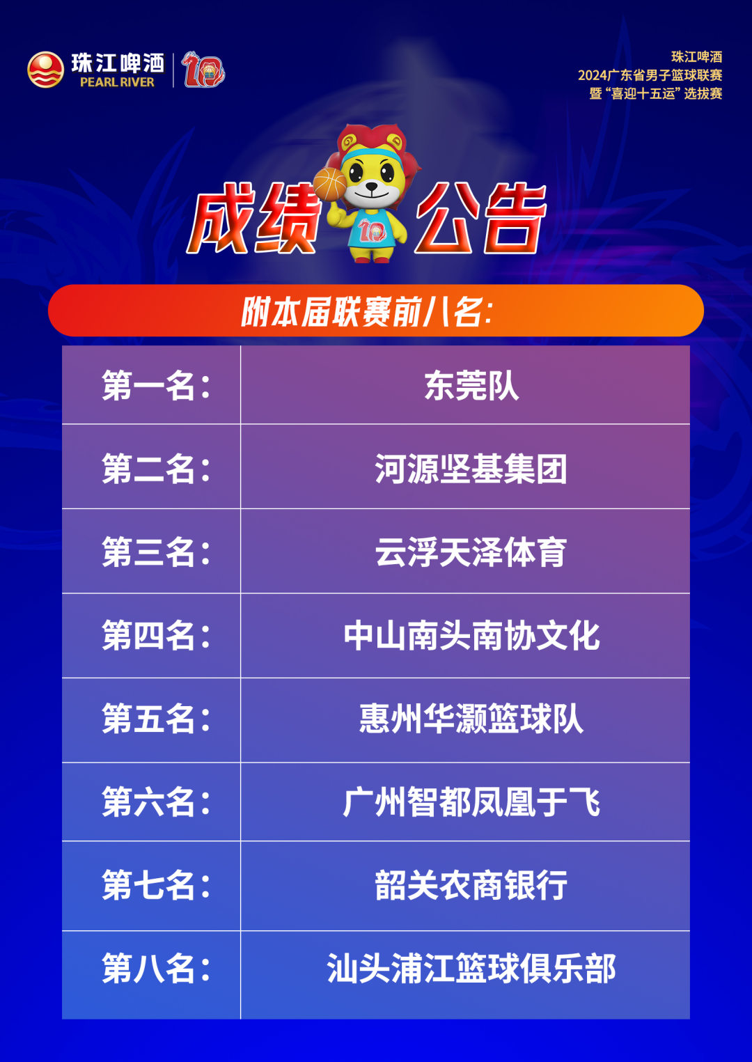 9月7日,珠江啤酒·2024广东省男子篮球联赛(简称“省联赛”)暨“喜迎十五运”选拔赛总决赛第二回合比赛在河源市体育馆落下帷幕,坐镇主场的河源队以71比74不敌东莞队,东莞队以2比0的总比分夺得冠军,捧起了广东省篮协为省联赛十周年特别打造的“盘龙奖杯”。东莞队的周泽源获评为总决赛最有价值球员。这也是东莞队连续第十年夺得省联赛冠军。